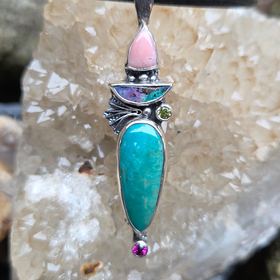 Spring Pendant in Pink Opal, Boulder Opal, Peridot, Turquoise, Rhodolite Garnet