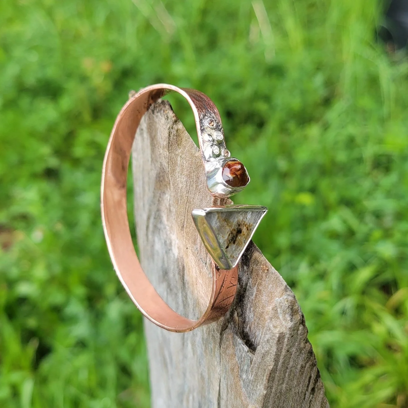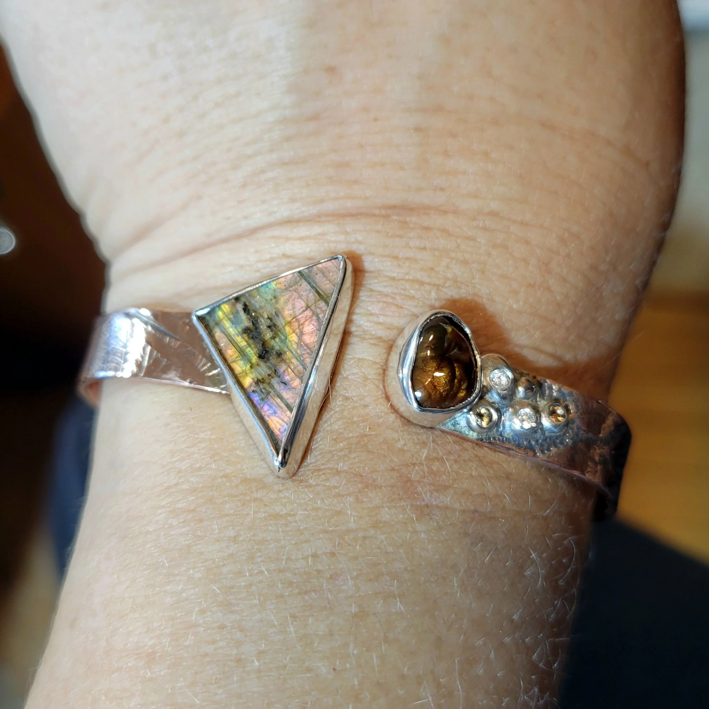 Both the Fire Agate (approx 11mm x 8mm) and the Labradorite (23mm x 15mm) were cut and polished at the Ozone Studios. They are set in Fine silver bezels, providing gorgeous contrast to the warm copper cuff. The White Topaz (natural, heat treated) and the Smokey Quartz (natural, heat treated) are all 2mm stones (not worked in house) and set in fine and sterling silver, to create a cascade of glimmer coming away from the Fire Agate. The Hydrangea Blossom textured and patinaed cuff is roughly 18 gauge, which makes it pliable enough to slip comfortably on and off, but rigid enough to stay put. The most wonderful thing about this design is, not only is it adjustable to make the most comfortable fit, but it brings the stress from opening and closing away from the stone settings and disperses it along the mid stretch of the copper cuff. All of this keeps those gems right where you can admire them any time and enjoy their beauty.
