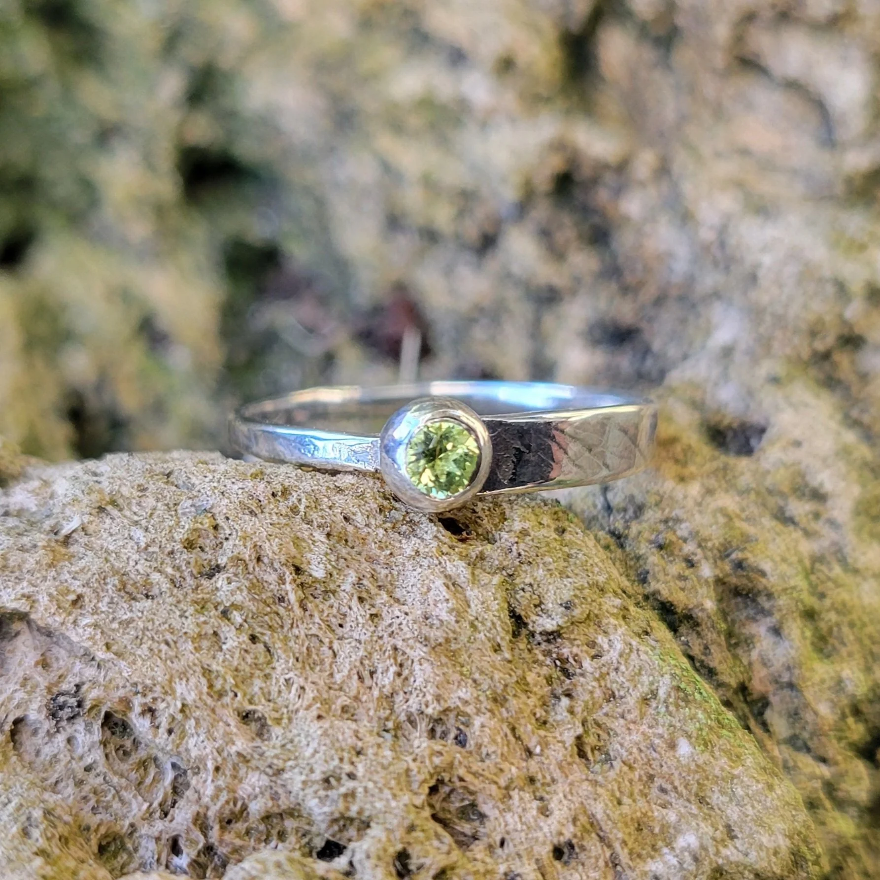 This sweet, green Peridot is completely natural, 3mm, and set in Fine Silver. The ‘wide to thin’ ring band is milled from 18 gauge sterling silver, and tapers from 3mm to roughly 1.6 mm. Hydrangea blossom is embossed into the silver and brought out by light patina. This ring has enough impact to stand alone and also would grace any ring stack it was paired with.