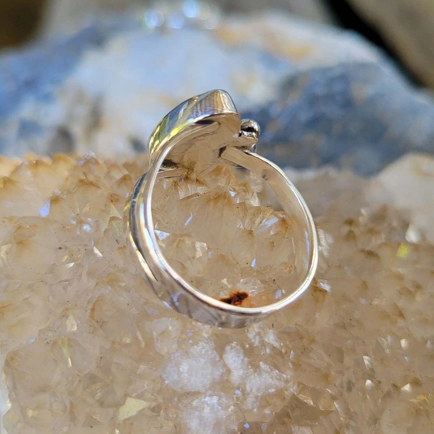 This wonderful natural Turquoise stone is a dance between a juicy aqua hue and dark matrix threading its way through. The stone measures 14mm by 7mm and set in Fine Silver. The White Topaz is 2mm and is also set in Fine Silver. The two to one ring band is Sterling Silver (as well as the ball embellishment) and is embossed with Hydrangea Blossom. The whole ring is patinaed to bring out the contrasts in the blossom texture. This lovely concert winds around your size 8 finger, with a little extra (size 8+, but not quite 8 1/4) for a very comfortable fit and a great accessory to all of your summertime outfits.